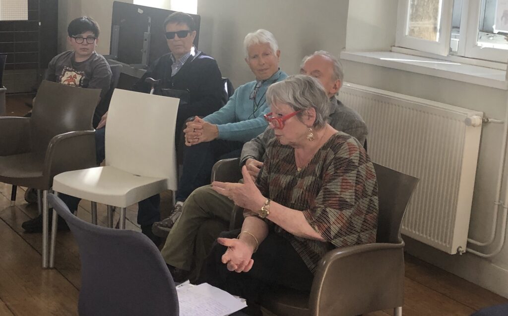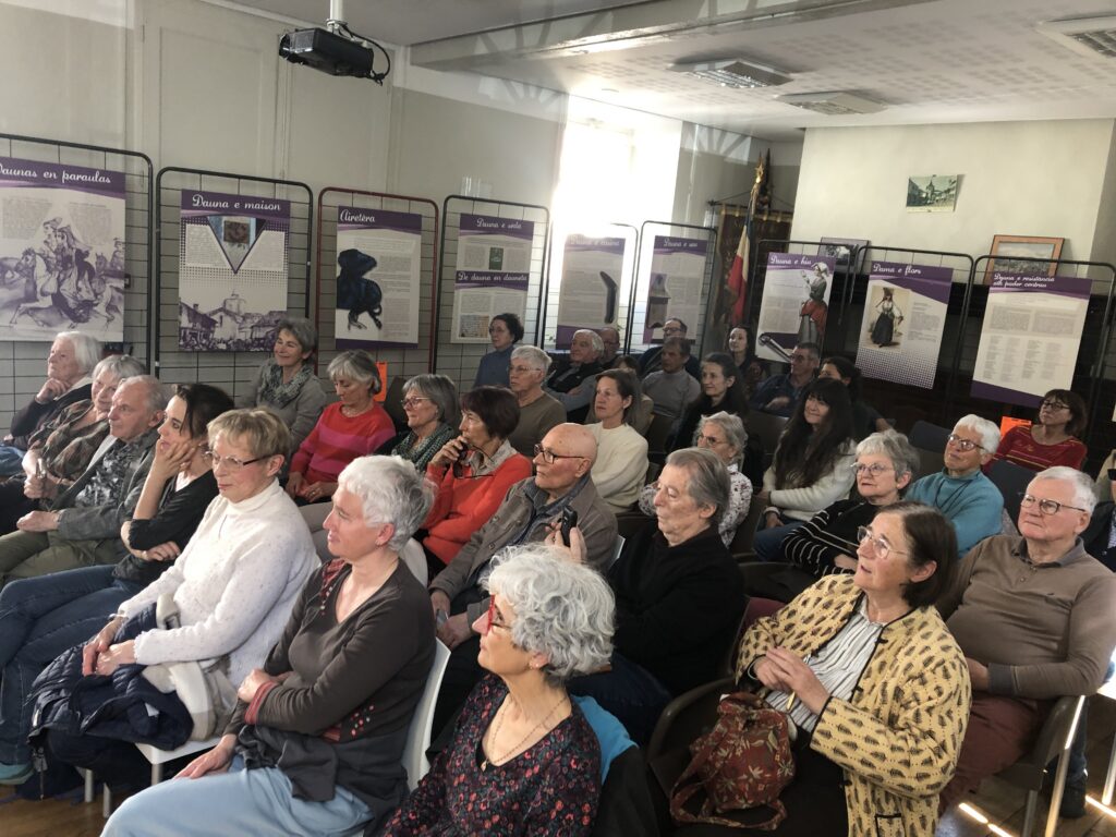 Trésia Pambrun nous présentant l’exposition qu’elle a créée autour des Daunas (maîtresses de maison) à partir d’un recueil de paroles « pour vous, une Daunas, vous la représenteriez comment ? ». 12 panneau bilingues occitan/français présentaient le résultat de ce travail, une exposition créée il y a plusieurs années et que Mme Pambrun nous a gracieusement offert de pouvoir exposer, et qu’elle nous a commenté en détail, malgré le sans doute trop court temps de parole qui lui a été alloué.