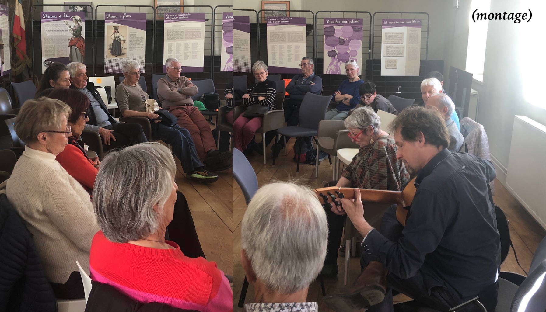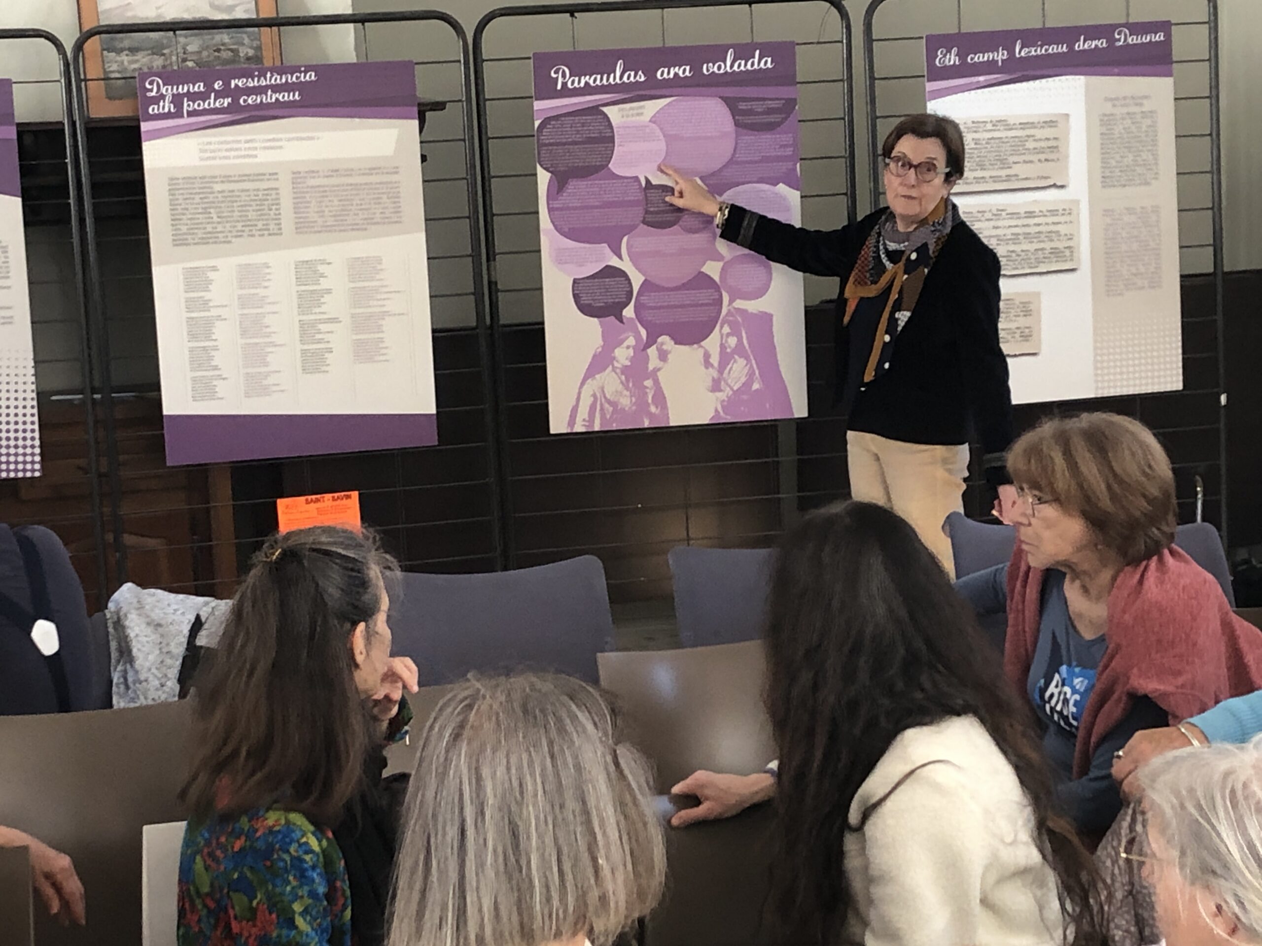 Trésia Pambrun nous présentant l’exposition qu’elle a créée autour des Daunas (maîtresses de maison) à partir d’un recueil de paroles « pour vous, une Daunas, vous la représenteriez comment ? ». 12 panneau bilingues occitan/français présentaient le résultat de ce travail, une exposition créée il y a plusieurs années et que Mme Pambrun nous a gracieusement offert de pouvoir exposer, et qu’elle nous a commenté en détail, malgré le sans doute trop court temps de parole qui lui a été alloué.